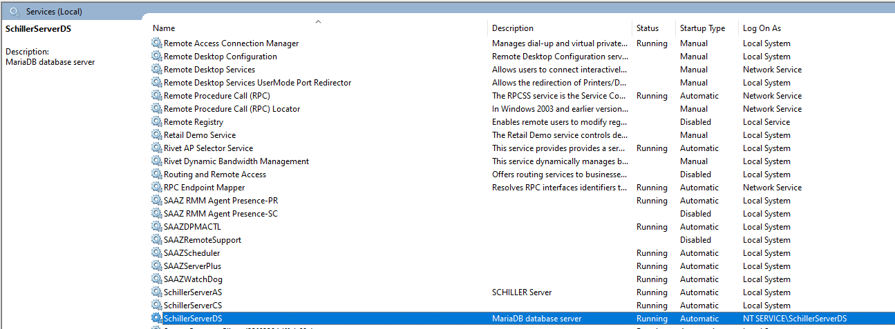 Deleting the C:/Schiller folder does not remove the SchillerServerDS service, and the error persists. It is possible to check which services are running through the Windows Services app.